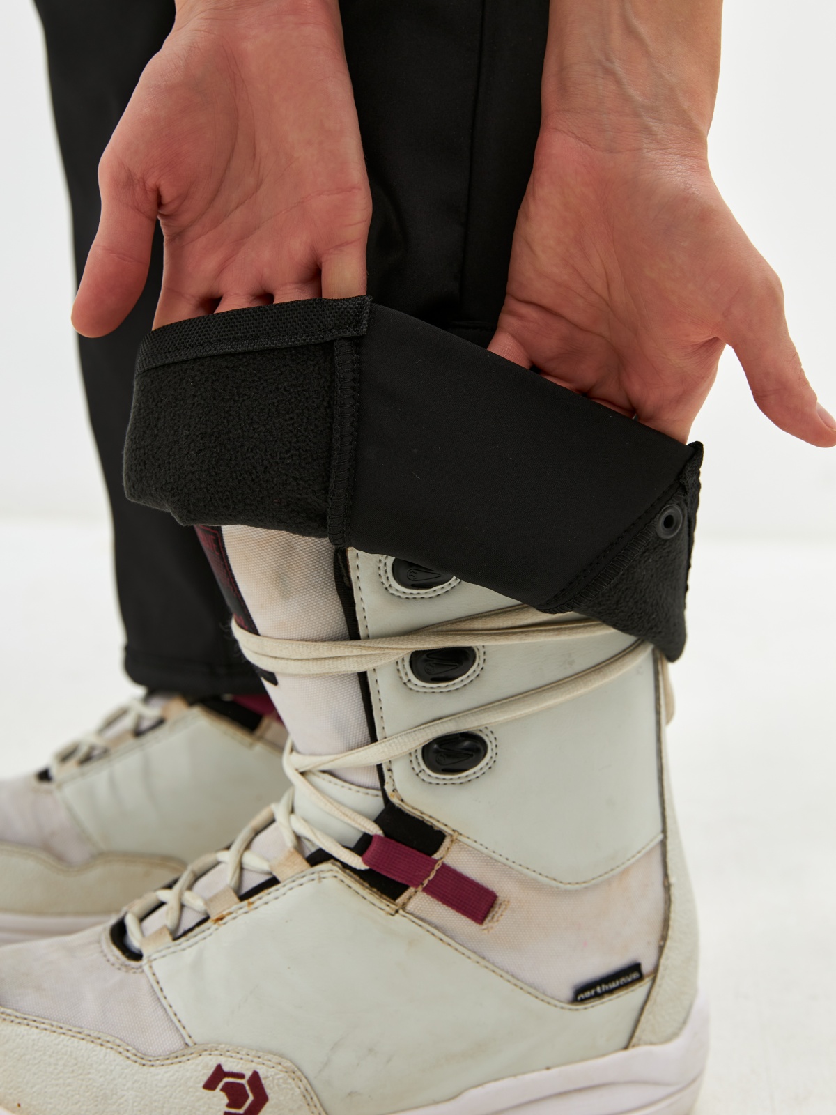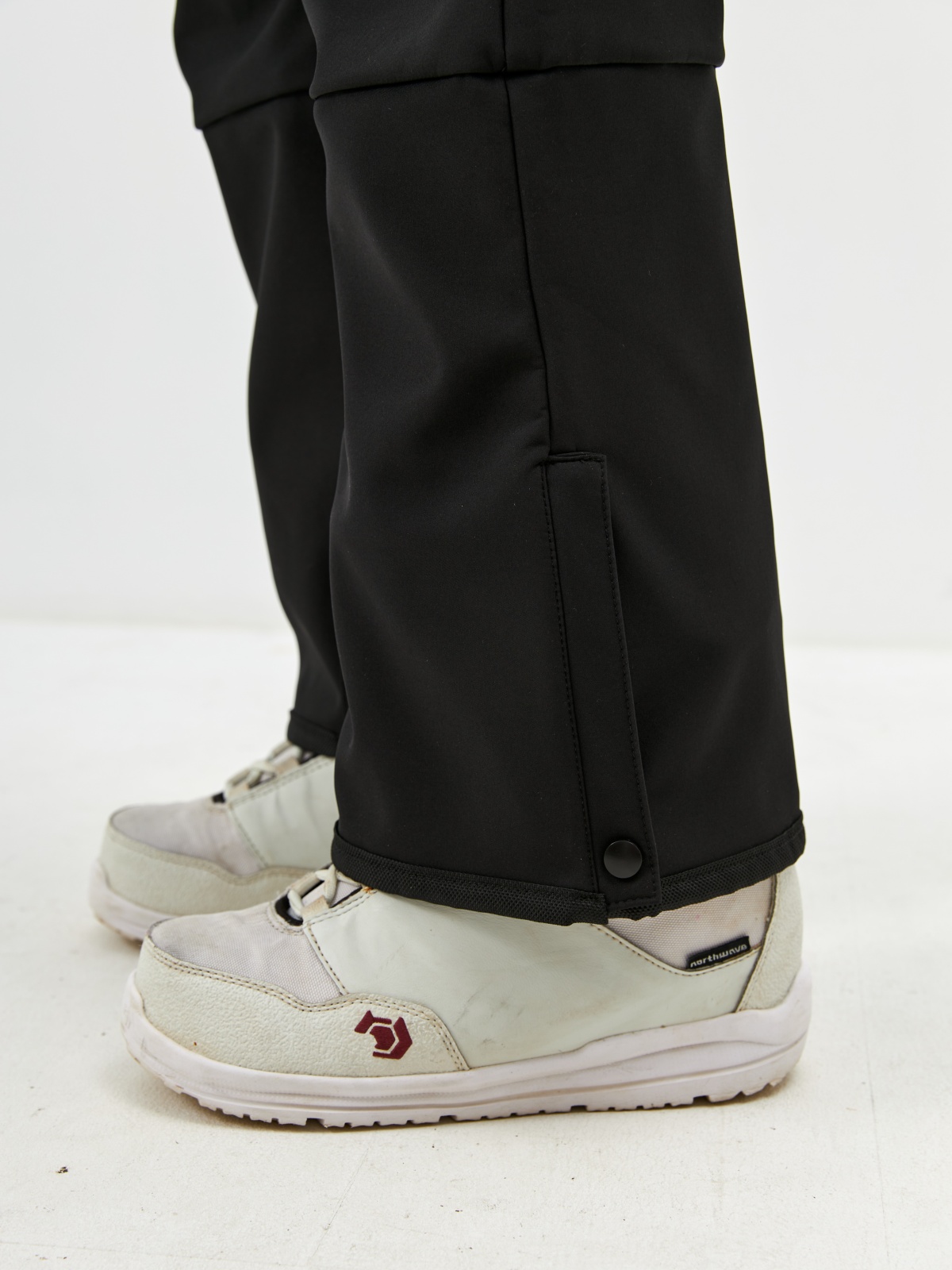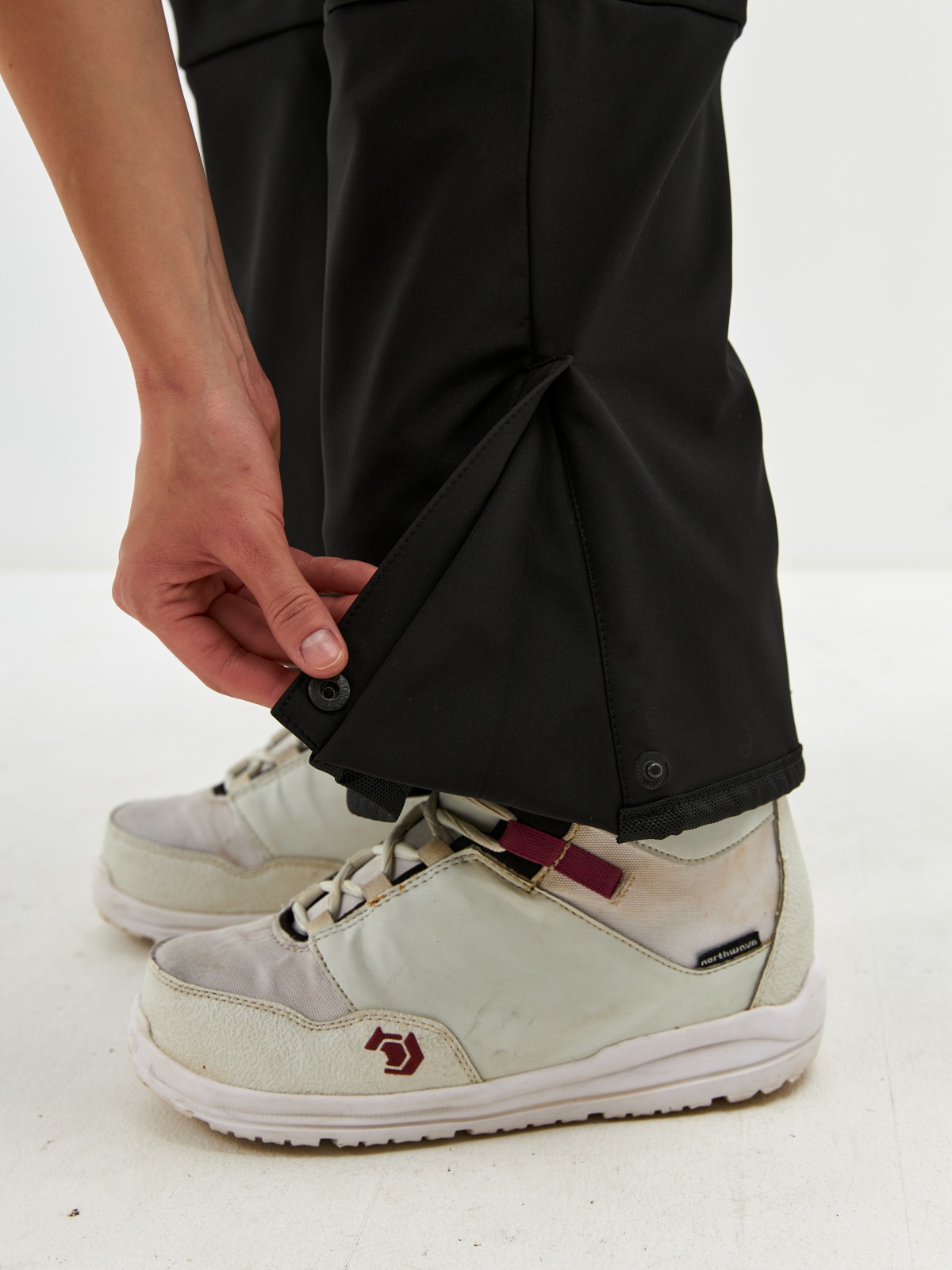 • Клиновидные вставки с кнопками для регулировки низа штанины под сноубордический ботинок.